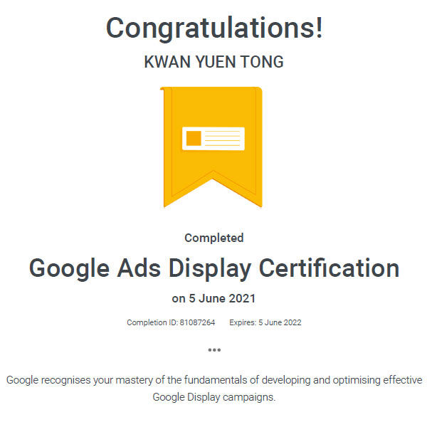 My Google Ads Display Certification Completion ID is 81087264.
