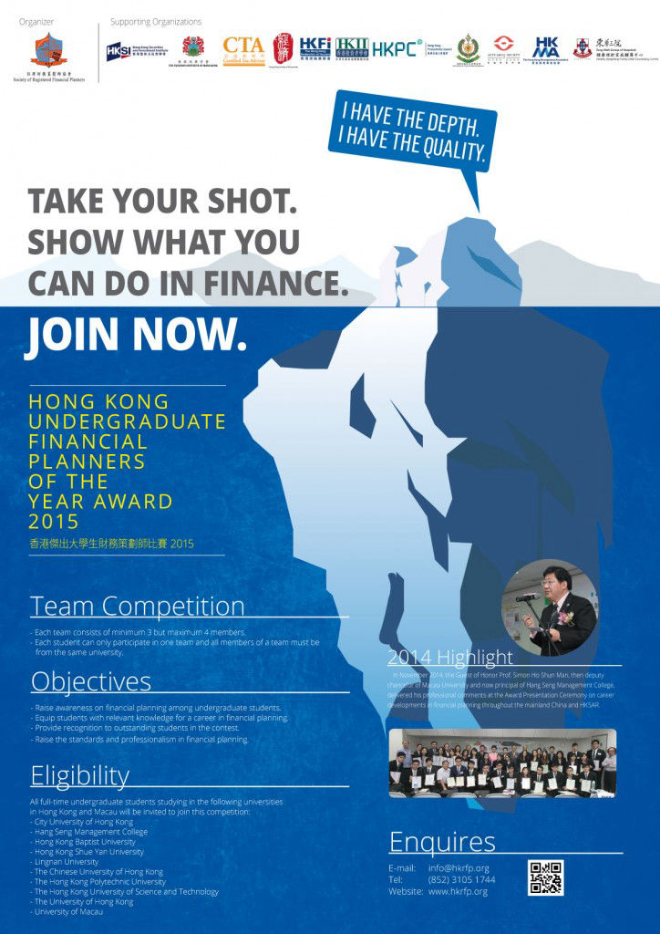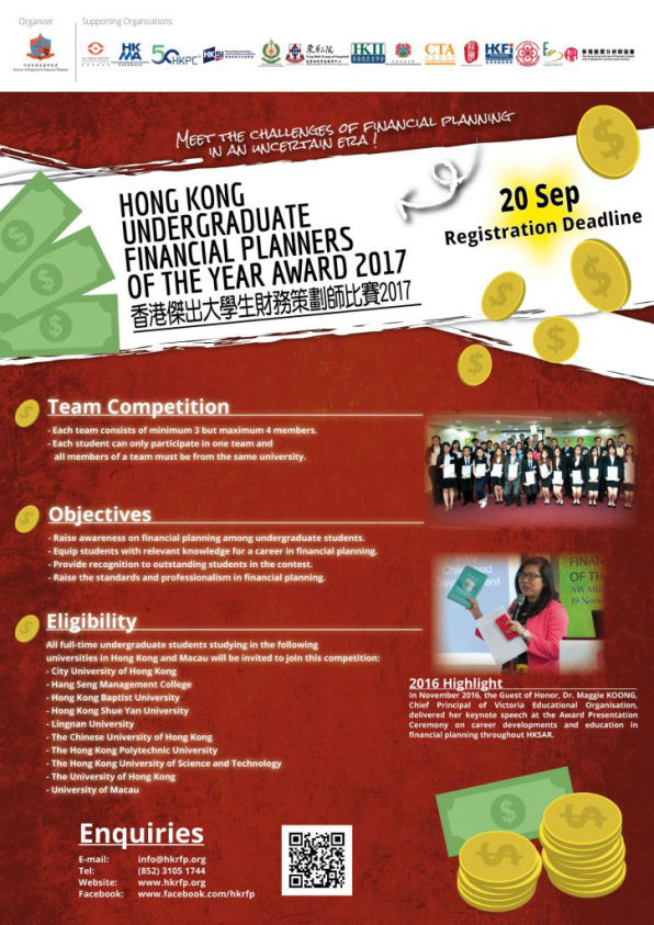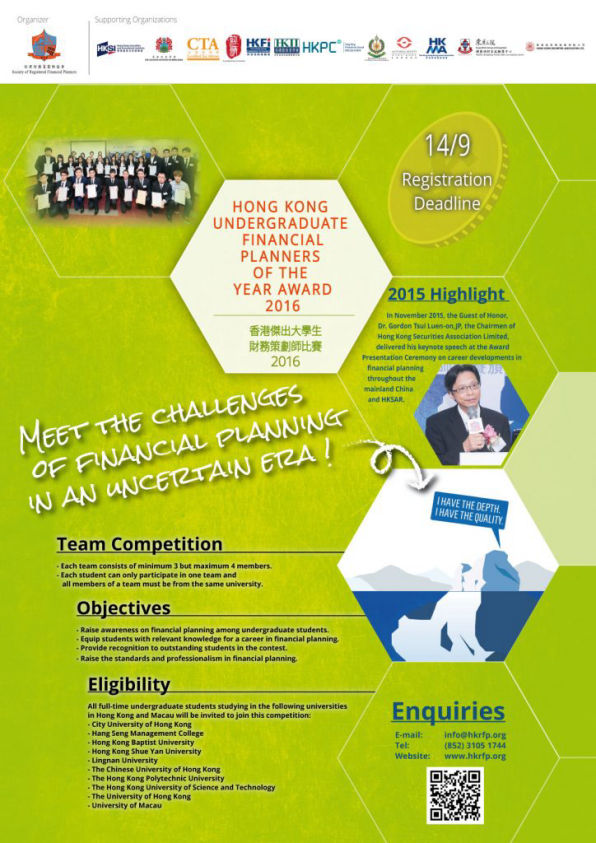 • Single-handedly planned and successfully executed more than 35 monthly seminars and annual university student competitions called "Hong Kong Undergraduate Financial Planners of the Year Award". Each competition had over 200 participants and was supported by more than 50 external parties including university societies, supporting organizations and financial veteran guests. An average of 8% annual growth in the number of participants was achieved during my tenure.